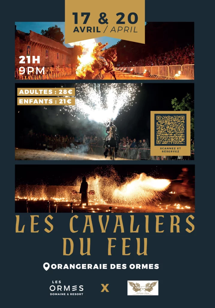 Créés pour les vacances d’avril 2026 du Domaine des Ormes, Les Cavaliers du Feu sont un show nocturne immersif où chaque sens est convoqué.